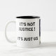 coffee mug with a charcoal drawing image done by Jo Ann Hayden, with script, It's not justice, it's just us!