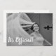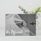This black and white wedding announcement is a great way to let your friends and family know that you have eloped, had a secret ceremony, or private wedding. The front of the card is designed to showcase your favourite horizontal orientation photo, with the words 'It's Official!' at the bottom left in a white, trendy brush script type. Your names, wedding date and location appear at the bottom right in a modern, fashion sans serif font. The back of the card allows you to type in a personal greeting, and also features a black and white framed vertical/portrait orientation photo. This is a template design, and is very easy to customise to suit your needs. Photo and design copyright Anastasia Surridge, 2017.