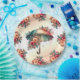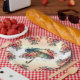 The design on these paper plates have a vintage floral style. There is a very colourful umbrella with a bouquet of flowers around it.