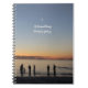A photo showing a silhouette of a family playing in the ocean at sunset under a crescent moon, it's small moments like these that bring joy into our lives