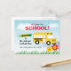 This back to school postcard features a design of a school bus with a banner reading: Welcome! The text at the top reads: It's Time for SCHOOL! Customizable text near the bottom allows you to add teacher's name, and school. The background is blue sky with white fluffy clouds, green grass and two cute smiling flowers.