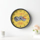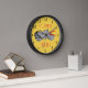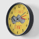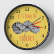 "It's time to cochet" is written on a round clock decorated with a black, grey and white skein of yarn, two bright red crochet hooks, all on a mustard yellow background. It's the perfect gift for the craft room or for anyone who loves to crochet. The clock has black hands and numbers.
