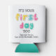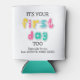 Cute IT'S YOUR FIRST DAY TOO Pre-School Mum Can Cooler, designed for schools or teachers to use as gifts to moms and dads who are adjusting to their little ones going to pre-school or kindergarten for the first time. Design shows fun colourful animal monster typography and there is CUSTOMIZABLE TEXT where you can add your teacher or school name. Matching gifts available.
