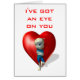 sweet little cyclop with big blue eye leaning on a red heart - waiting for his greatest love ever