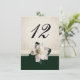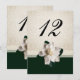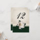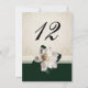 Elegant wedding reception table number card done in a ivory damask design, with a dark green band, across the bottom. Graphics of ivory lace ribbon and a white gardenia decorate the bottom half of the table number card. Personalise the number for each table at your reception.