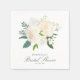 Beautiful and elegant bridal shower napkins, featuring a watercolor bouquet of cream and ivory roses and green leaves, and mix of sage green script font and dark grey serif font to personalise.