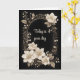 Clusters of ivory and cream flowers and small buds encircle a gold frame on a black background on this beautiful birthday card.