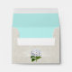 Elegant wedding invitation response card envelope, done in an ivory linen look, with a light aquamarine, on the inside. Vintage graphics of a white hydrangea and white flourishes decorate the back of the envelope. Personalise the black address, on the front, of the envelope. Matches our Pastel Hydrangeas wedding set.