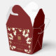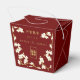 Oriental peach / plum blossoms, spring flowers in cream / ivory / white on a dark burgundy red / matte brass gold background with a simple rectangle double happiness symbol wedding party favour gift box. An elegant and romantic floral chinese themed wedding reception card design which is whimsical, modern and classy.