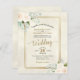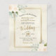 These affordable, budget friendly wedding invitations are the perfect choice for class, style, and beauty on a budget. The elegant design features hand painted watercolor roses in shades of ivory and peach, with a bevy of eucalyptus leaves and greenery on a marbled cream coloured background. The typography features fancy script calligraphy, and there is a beautiful golden faux foil border. Wonderful way to invite your friends and family to share in your joy on your special day without breaking the bank.