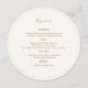Stylish and chic. This round wedding card includes table number and wedding menu on either side. The design includes a contemporary set of fonts in olive green against a soft ivory background. The template includes 4 meal and drink sections.