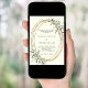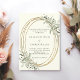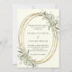 An ivory coloured background decorated with sage green greenery. A faux gold frame. Personalise and add your names and details.