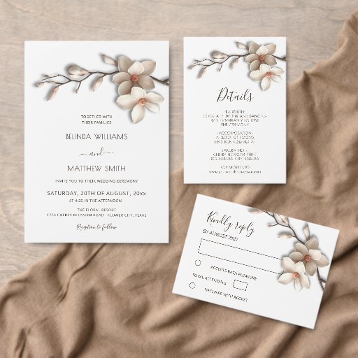 Ivory White 3D Magnolia Flower Minimalist Wedding Invitation