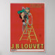 Vintage advertising poster featuring a cyclist climbing steep inclines using a tall ladder, emphasizing the bicycle's impressive capabilities. Bright colours and bold text promote J.B. Louvet, adding a vintage and adventurous touch. Published in 1922 in France.