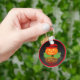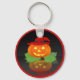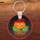 This is an image of a Jack O Lantern all dressed up. An orange pumpkin with a red witches hat is sitting on a bed of green leaves. The Jack o Lantern is lit up with bright eyes and a smile. A black backround was also added so you can see his reflection. A red border was added. These key chains are available in assorted styles and sizes.