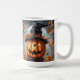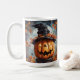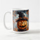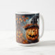 Festive Jack O Lantern wearing a witch hat will colourful Autumn leaves all around.
