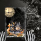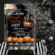 Spooky "Halloween Pumpkin Carving Party" design featuring a variety of jack-o-lanterns sitting on a fence and one sporting a witches' hat. The back features a haunted house with a full moon and a spider and spider web. A design for the Halloween holiday season that is sure to delight your guests!