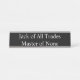 A desk name plate with the funny job title of "Jack of All Trades, Master of None."