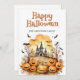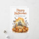Happy Halloween card featuring watercolor illustrations of bats, jack o’lanterns and ghosts. Easily personalise this Halloween card with your family name and text.