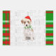 This cute Jack Russell Terrier dog is ready for the holiday season a red Santa cap and green and white striped scarf, making this dog a real fashionista. This cute Christmas dog is paired with a plaid print in bright seasonal hues of red and green on this set of gift wrap for the dog lover.
