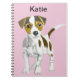 This lovely personalised notebook features my drawing of a cuteJack Russell terrier puppy against a pink background. The Jack Russell is white with brown patches and a brown and white face with big appealing eyes.