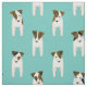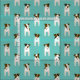 This charming Jack Russell Terriers fabric features eight cartoon JRT dogs with varied brown and black facial and body markings arranged in a staggered pattern - the background colour is customisable, currently light teal - Jack Russell Terriers pattern © katz_d_zynes 2019