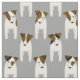 This charming Jack Russell Terriers fabric features eight cartoon JRT dogs with varied brown and black facial and body markings arranged in a tight staggered pattern - the background colour is customisable, currently medium grey - Jack Russell Terriers pattern © katz_d_zynes 2019