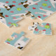 This cute Parson / Jack Russell Terrier jigsaw puzzle features a randomly arranged pattern of illustrated JRTs / PRTs, each with varied brown and black head and ear markings and an adorable head tilt, with scattered tennis balls and red and pink confetti hearts on a light grayed teal background - name and monogram are customizable - by katz_d_zynes