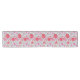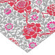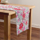 Table runner in a William Morris wallpaper design of flowers in deep red and fuchsia pink, with silver grey / grey leafy vines, against a white background