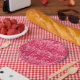 Paper plates in an Art Nouveau, Jacobean damask pattern of stylised, scrolled leaves and flowers, based on a vintage William Morris textile design, digitally enhanced and coloured in shades of medium to deep fuchsia pink, with a pastel pink background