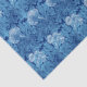 Art Nouveau, Jacobean damask pattern tissue paper of stylised, scrolled leaves and flowers, based on a vintage William Morris textile design, digitally enhanced and coloured in light sky blue on a deep navy / indigo blue background, accented with white flowers