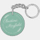 A pretty jade green keychain featuring an elegant script name paired with a delicate botanical wreath and small business name beneath. The feminine typography and rich green palette make this a charming branded accessory for small business owners, realtors, interior designers, boutique shops, or creative entrepreneurs. The name, business name, and text fields are fully customisable.