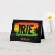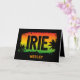 Cool greeting card printed with the word IRIE over tropical palm tree silhouettes on a rasta flag coloured fading sunset