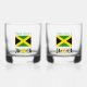 Add your name in green letters to these two whiskey glasses for a personalised effect or gift, above the Jamaican flag with the word JAMAICA underneath, in the colours of the flag. Great way to share your love and pride in your ancestry, culture and heritage. Terrific for clubs or travel groups and reunions of family, friends and groups. Cool housewarming gift for a home bar.