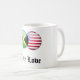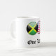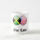 mug that has the american flag and jamaican flag locked together with "one love" written in black