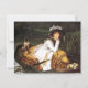 James Tissot Young Lady in a Boat invitations. Oil painting on canvas from 1870. French artist James Tissot frequently featured beautiful young women in his artwork. Young Lady in a Boat depicts a pretty brunette in a white Victorian dress lounging in a small rowboat parked among reeds at the edge of a lake. The woman holds her chin in her hand and holds a yellow fan in the other. She is draped by an intricate blanket. A bunch of yellow and purple wildflowers sits in front of her, and a cute little pug sits at the helm of the boat. A beautiful gift for fans of Tissot, Victorian art, and vintage boat paintings.