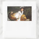 James Tissot Young Lady in a Boat stickers. Oil painting on canvas from 1870. French artist James Tissot frequently featured beautiful young women in his artwork. Young Lady in a Boat depicts a pretty brunette in a white Victorian dress lounging in a small rowboat parked among reeds at the edge of a lake. The woman holds her chin in her hand and holds a yellow fan in the other. She is draped by an intricate blanket. A bunch of yellow and purple wildflowers sits in front of her, and a cute little pug sits at the helm of the boat. A beautiful gift for fans of Tissot, Victorian art, and vintage boat paintings.