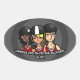 Here come 3 members of a Roller Derby Team, wearing their team colors red, black and white. Each holds a different position. A Jammer, with curly black hair wearing a white star Derby helmet. The Pivot complete with her black stripes under her eyes, with blond hair sporting the striped cap over her helmet and finally a feisty brunette blocker with a fresh black eye. The text beneath reads: Jammers and Pivots and Blockers. OH MY!