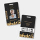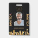 A black background, with a faux gold city skyline as decor. Template for your business logo, a photo and a text on front. Golden letters.