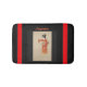 This rug is just as pictured! Vibrant Red and very soft material, nice to step in out of the tub! Matches my set of accessories and shower curtain! A must have to add some whimsy to your bathroom! Very nice, vibrant and clear print! Beautiful!