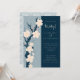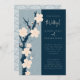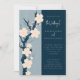 Japandi inspired wedding invitation, featuring a cherry blossom branch on the left side of the card against a light blue background, while the invitation text stands out on a darker blue backdrop. The reverse side features a coordinating pattern in light blue, adding a touch of Scandinavian fusion to your invitation suite.