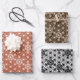 Wrapping paper in a traditional Japanese Asanoha, or star pattern in terracotta / rust outlined in white, dark chocolate brown outlined in light beige, and white outlined in black