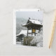 The bell tower of Honkokuji Temple in Kyoto, with its unusual gold bell, on a snowy day.
