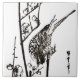 Digital enhancement of an antique Japanese sketch of a sparrow perched on a branch of cherry blossoms, rendered in a black ink effect on a white background