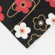 Vector illustration of stylised black, red, and white sakura cherry blossom flowers and golden swirls on black background. Inspired by traditional kimono fabric patterns of Japan.