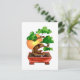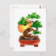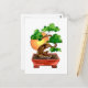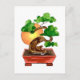 traditional watercolor and ink design of a comic style japanese bonsai tree growing from a red pot with the sun behind on a postcard.