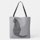 Mixed media digital graphic print bag of a Japanese inspired sitting cat, in a stylised floral, against a kimono print background - Black and white with shades of silver grey / grey