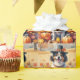 A watercolor-style painting of a cheerful dog sitting amidst a pile of vibrant fall leaves, surrounded by tiny pumpkins and scattered acorns. The dog wears a little pilgrim hat and beams with joy, capturing the spirit of Thanksgiving. In the background, soft harvest fields and golden-hued trees create a peaceful countryside ambiance. Gentle textures and warm, muted autumn tones give the scene a cosy, nostalgic feel perfect for celebrating the beauty of the season.