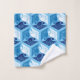 Towel set in a classic Japanese kimono pattern of stylised cranes, arranged in a pattern of hexagons, in navy / indigo blue, medium blue, and white, on a light sky blue background