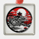 Illustration of a Japanese garden with trees, pond, rocks and a pagoda in red, white and black colours surrounded with grunge black circle